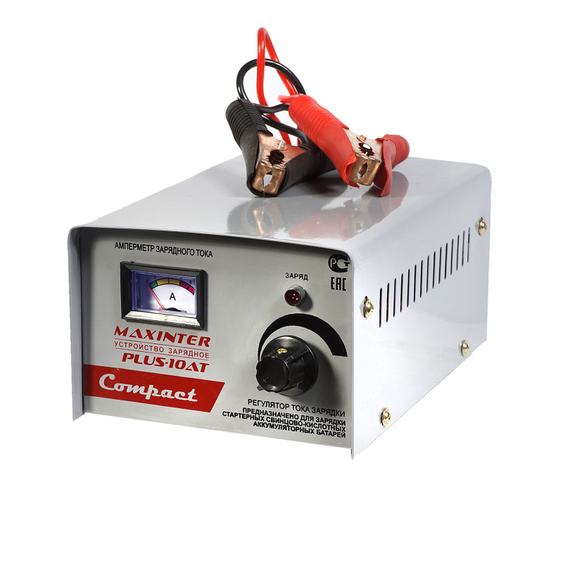 Maxinter ПЛЮС-10 АТ зарядное устройство предназначен для зарядки стартерных свинцово-кислотных аккумуляторных батарей емкостью до 100 Ач в т. ч. глубоко разряженных автомобильных аккумуляторов.