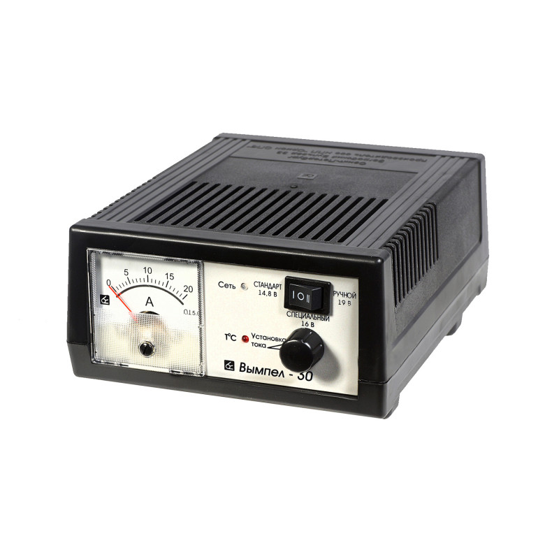 Вымпел-30 зарядное устройство предназначен для зарядки свинцово-кислотных аккумуляторных батарей емкостью до 240 Ач. Напряжение на выходе 14.8В, 16В, 19В.